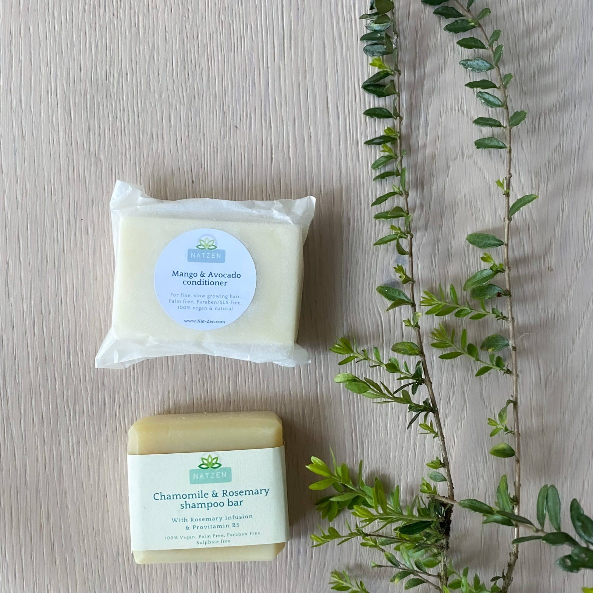 If you have straight and wavy hair, but you have a very little volume, you are experiencing hair loss, your hair is prone to dry scalp and breakage and you struggle with split ends, then Chamomile & Rosemary shampoo bar and Mango & Avocado conditioner are for you.